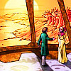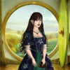 Description: A plump brown-haired purple-eyed white woman with gold facial markings and flowers in her hair, sitting in front of an asexual pride flag gradient background.